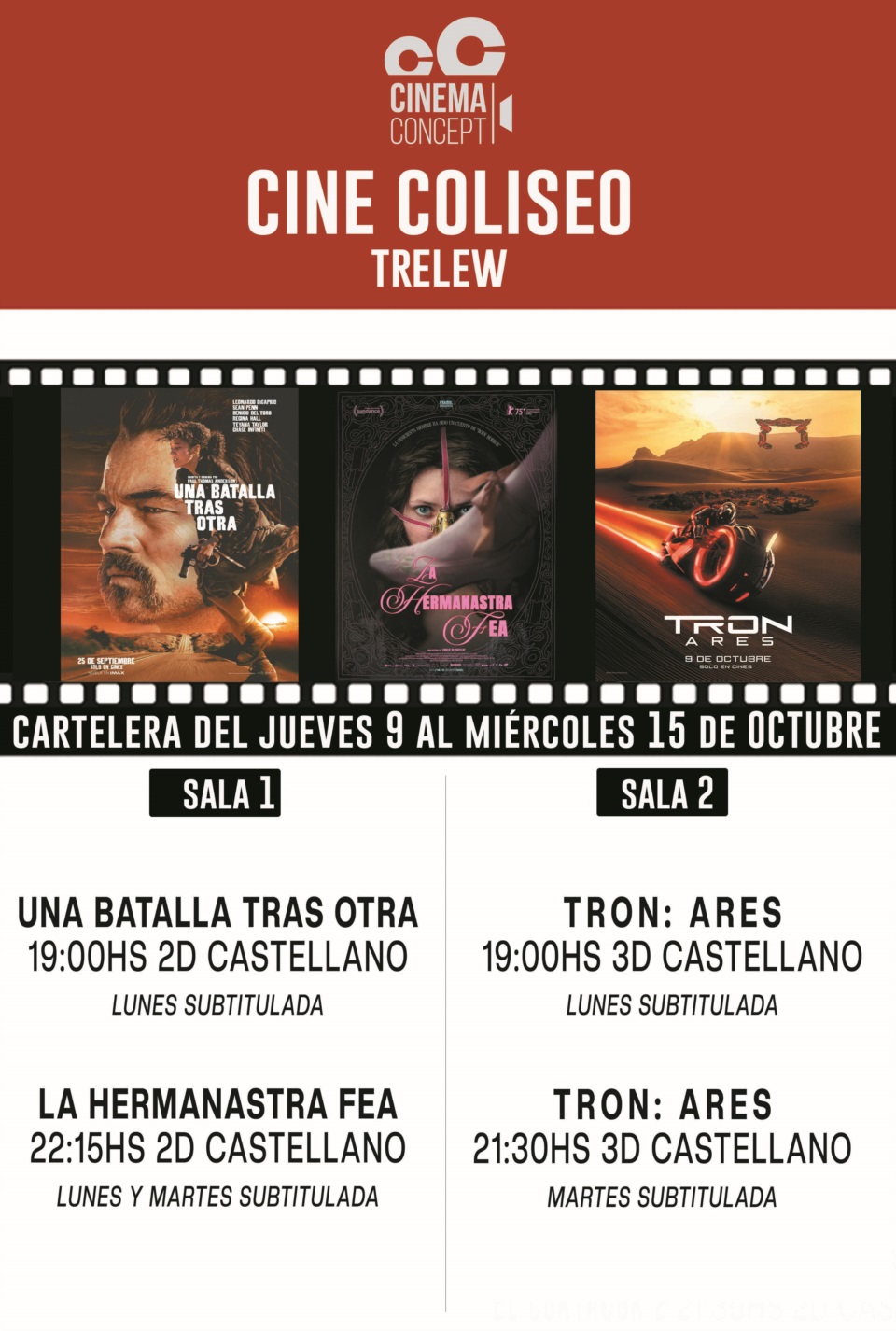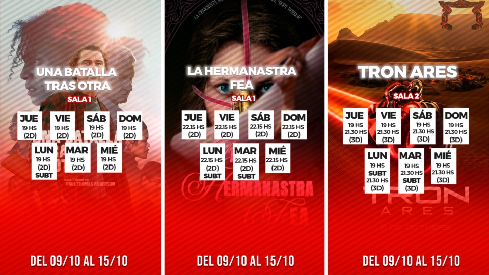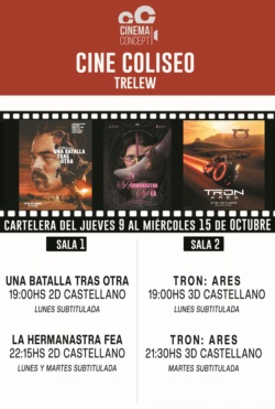 Cine Coliseo Trelew presenta su nueva cartelera con dos grandes estrenos de la semana: “Tron: Ares” y “La Hermanastra Fea”, junto con el éxito “Una batalla tras otra”.